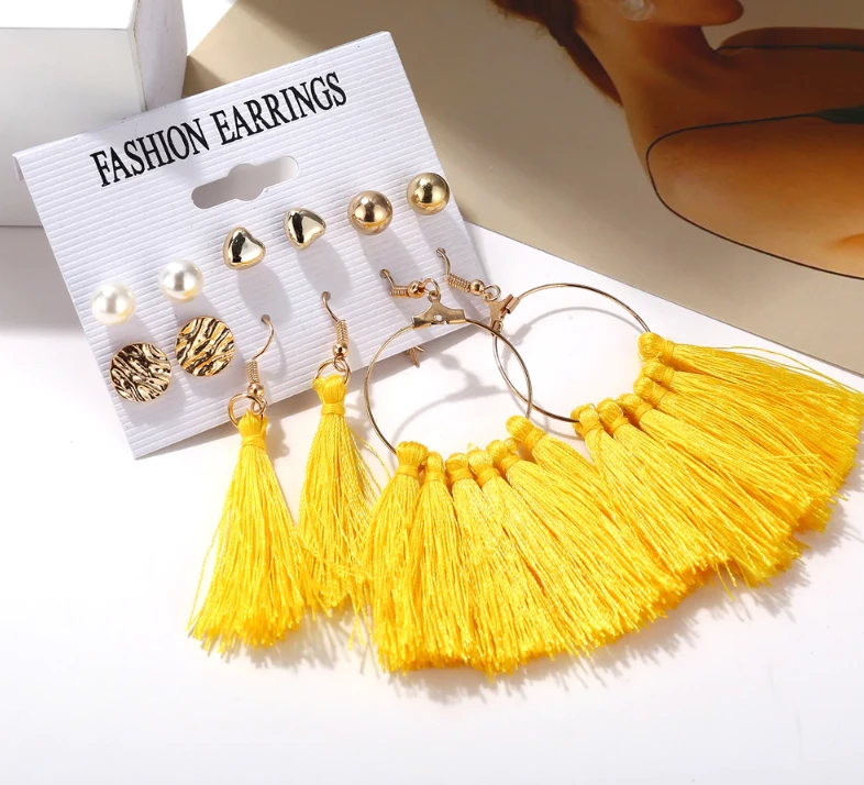Mettez de la couleur dans votre style avec cet ensemble de 6 paires de boucles d’oreilles comprenant des pompons jaunes, des perles et des motifs texturés dorés. Cet ensemble est parfait pour ajouter une touche audacieuse et chic à vos tenues, avec des options variées qui conviennent à toutes les occasions.