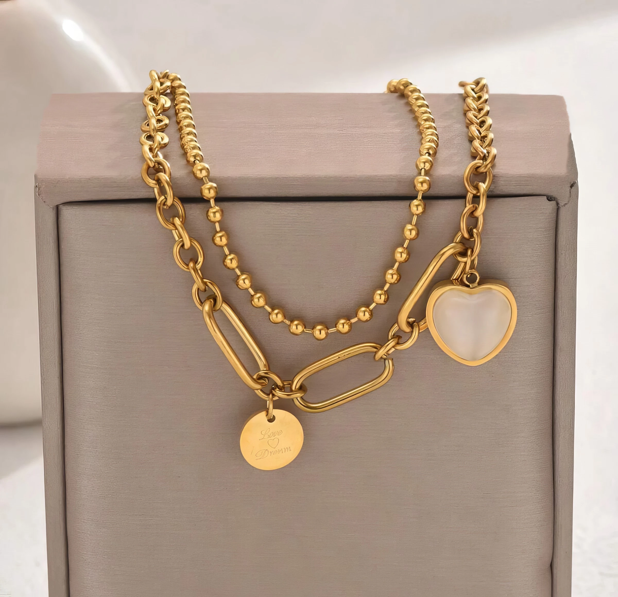 Design : Double chaîne avec perles et pendentifs élégants