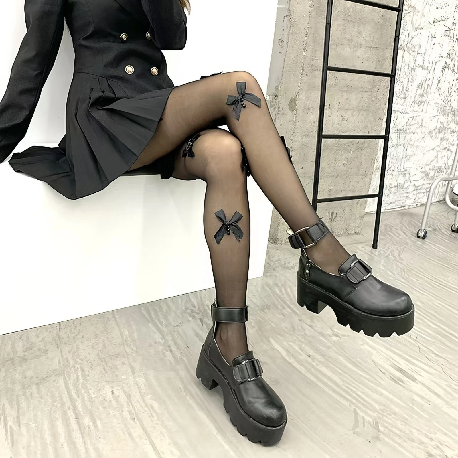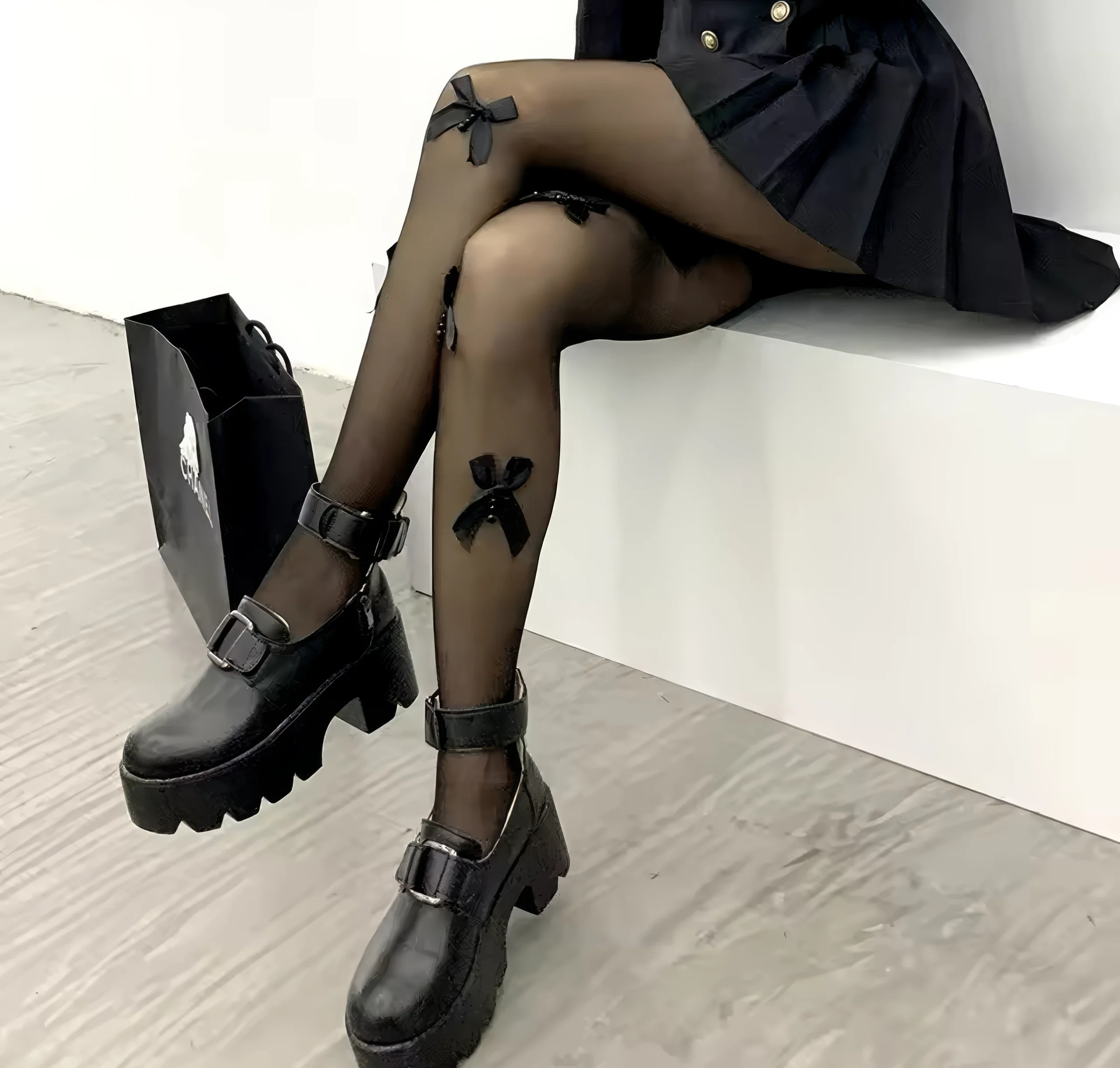 • Design : Collant noir décoré de nœuds en tissu cousus sur l’avant et les côtés