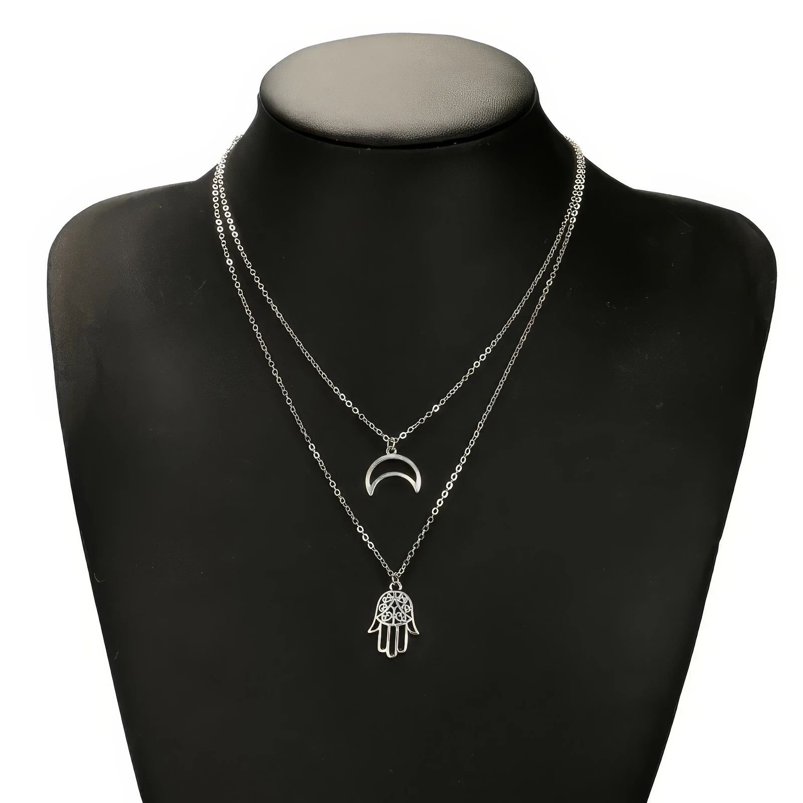 • 1 Collier Double Rang en alliage avec pendentifs lune et main de Fatma