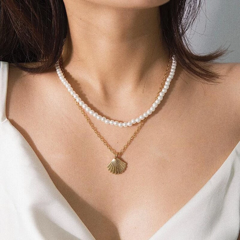 • 1 Collier Double Rang avec perles et pendentif coquillage doré