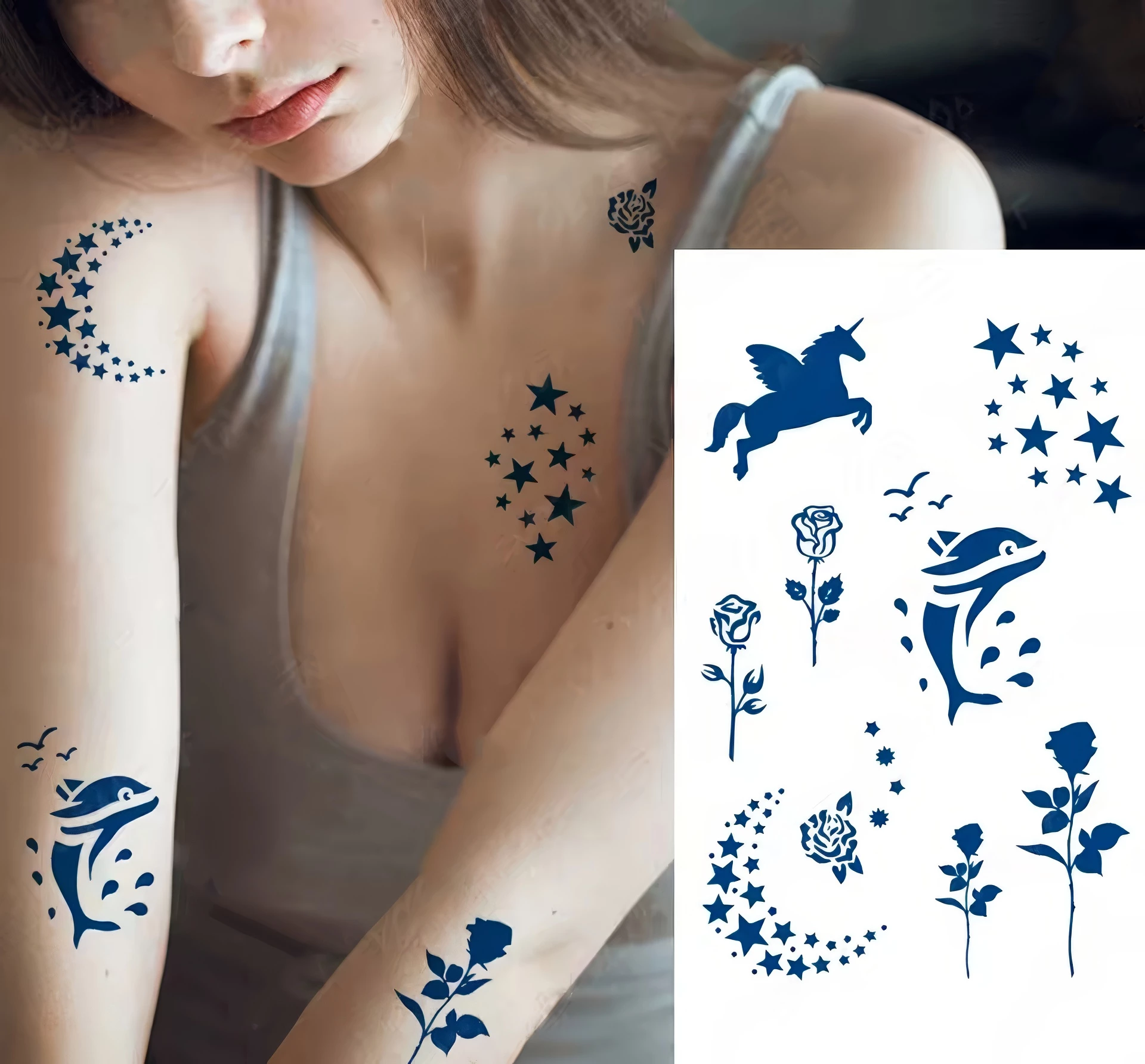 Tatouages Temporaires – Dauphin, Licorne & Étoiles Féeriques