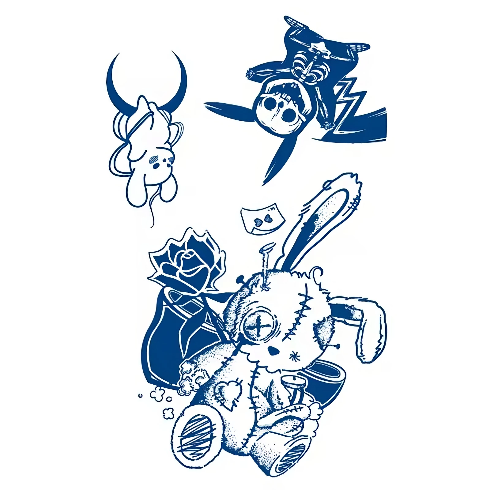 • Motifs : Lapin cousu, rose, crâne volant, personnage suspendu